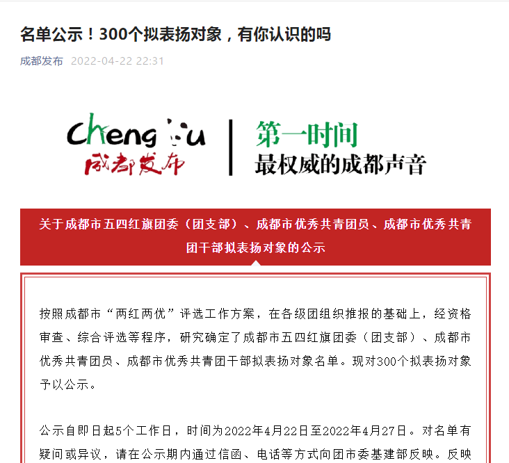 喜報我公司楊春鋒同志在成都市“兩紅兩優”評選工作中,被評為成都市優秀共青團員,現于“成都發布”官方平臺進行公示。楊春鋒總經理助理楊春鋒同志,于2016年畢業于四...